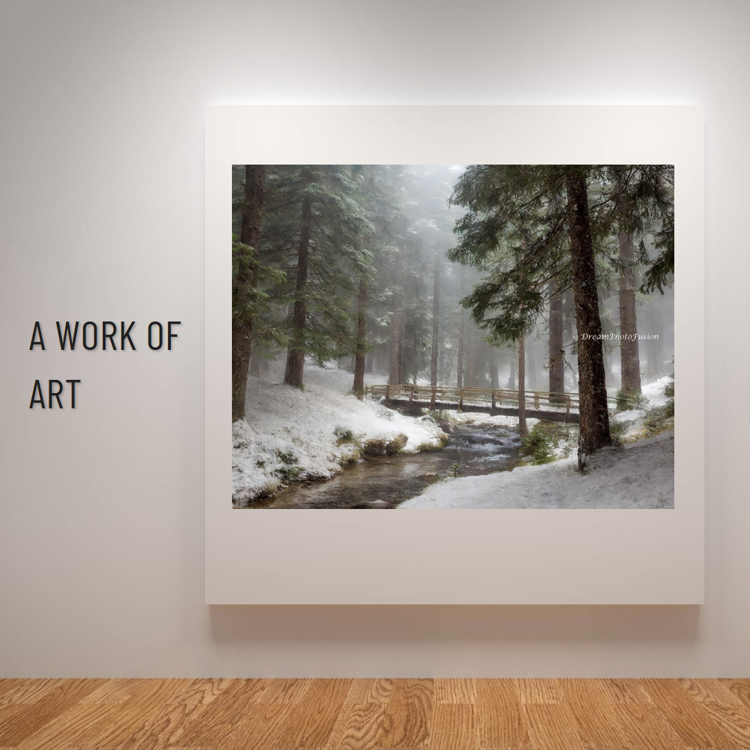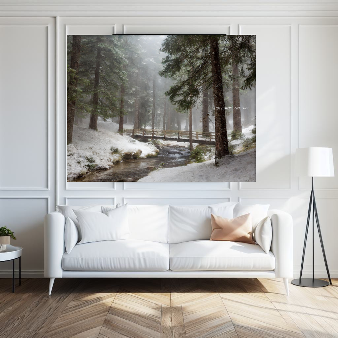 Journey through a mystical winter forest, where snowflakes and pines craft a silent, serene world, brought to life through the digital brushstrokes, bringing a piece of eternal beauty into your home and heart.