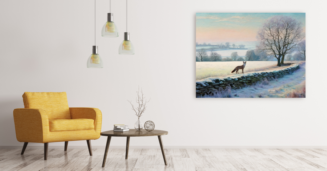 Experience the serene beauty of a frosty morning, where a lone fox wanders through a meadow, captured in this exquisite digital brushstrokes art, bringing a piece of eternal beauty into your home and heart.
