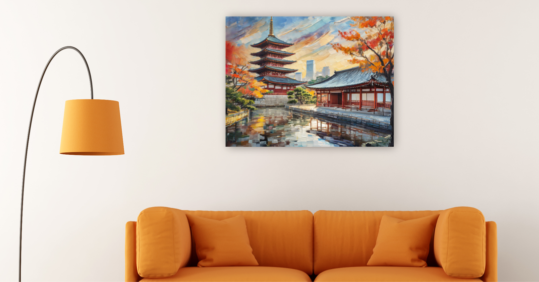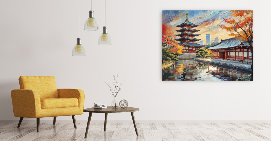 Experience the tranquil beauty of Tokyo's Senso-ji Temple, enveloped in a serene winter wonderland. The temple stands majestic, its reflection shimmering in the tranquil waters, as if the past and present have merged in a dance of warm hues and serene beauty, bringing a piece of eternal beauty into your home and heart.